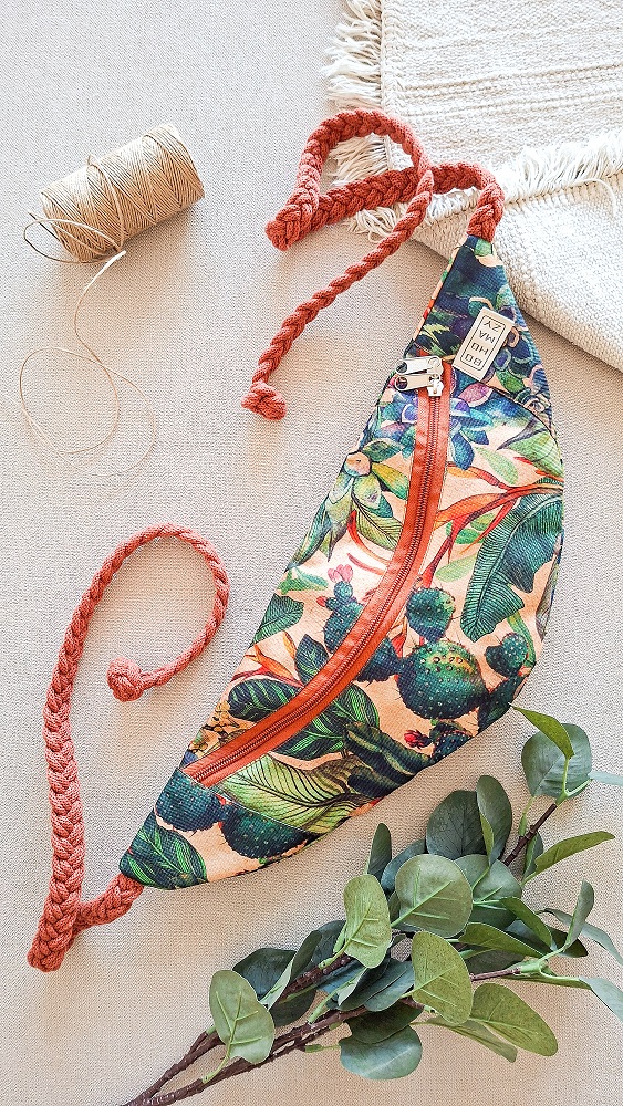 Wykończenie stanowią ręcznie zaplatane bawełniane sznurki – trwałe, wygodne i stabilne w użytkowaniu.